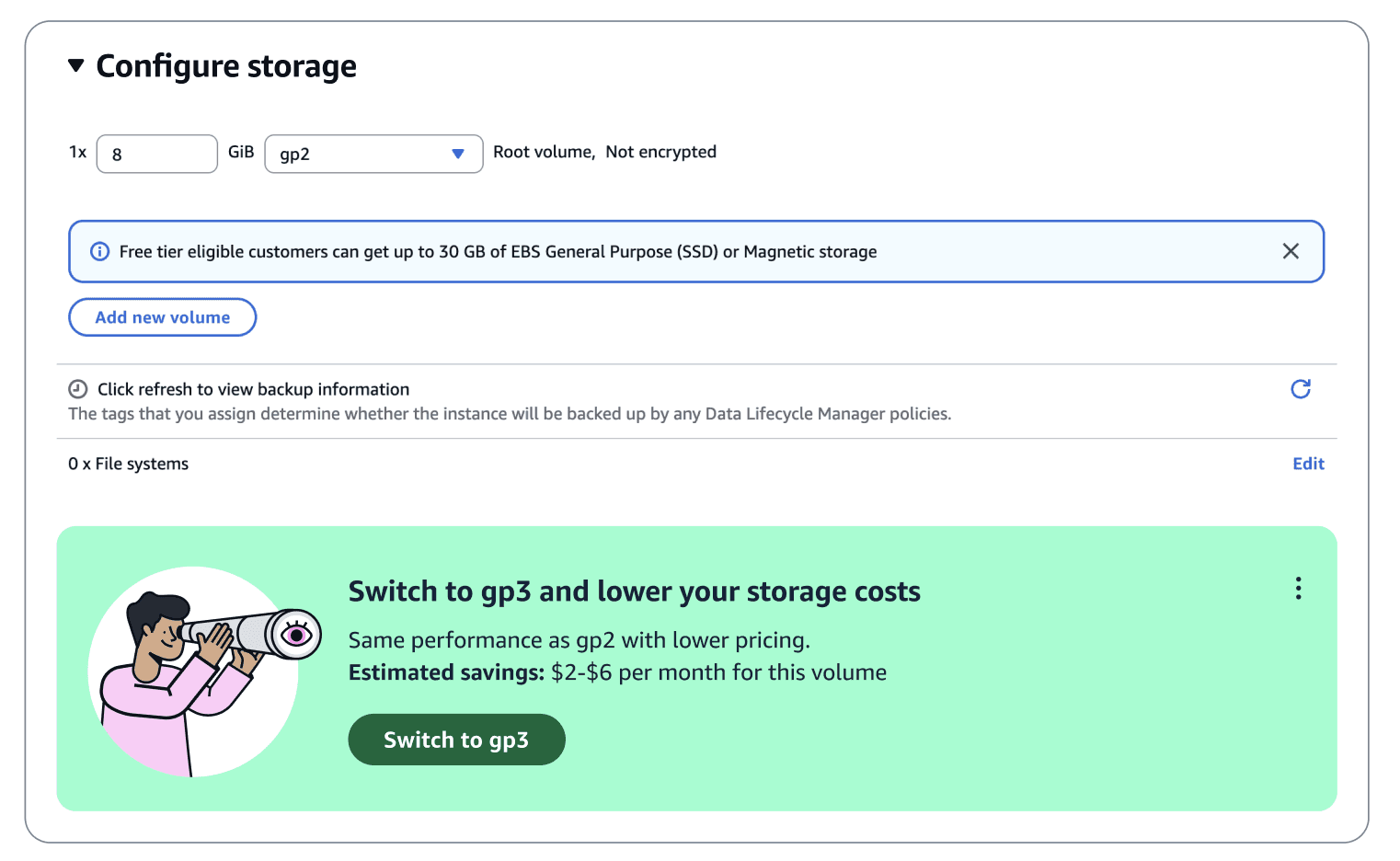 One example of how UFIL can help our customers is a common scenario where a customer launches a new EC2 instance, scrolls down to configure storage, and leaves the default volume type set to gp2 which is both more expensive and has worse baseline performance than our newer gp3 version.