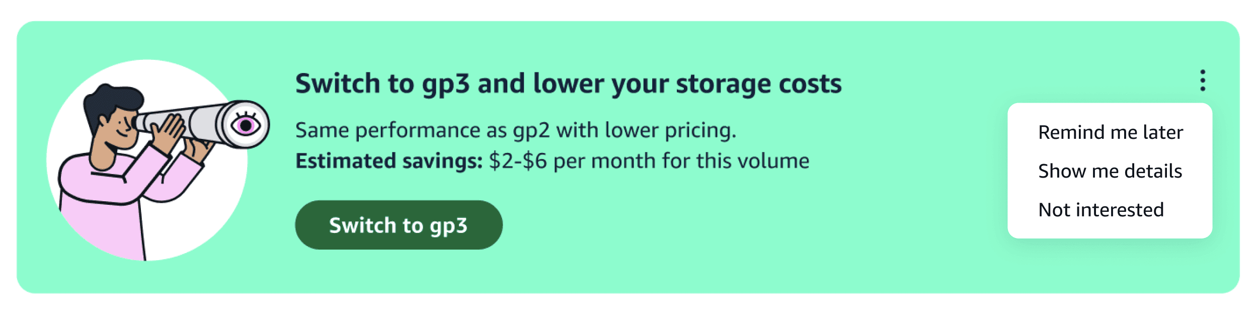 A banner then appears not at the top of the page, not in a sidebar, but right inside the container where the decision is happening. This banner shows estimated monthly savings, offers one primary action, and also gives the user three options: snooze it, see details, or permanently dismiss it.